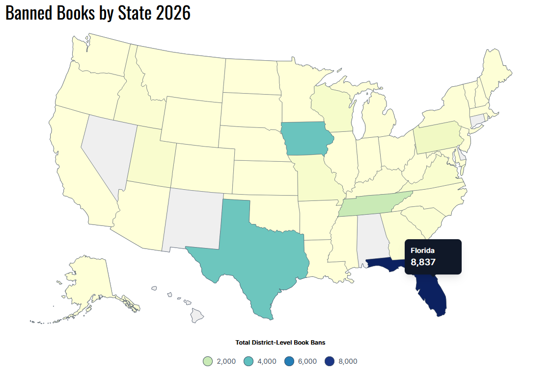 During the 2024–2025 school year alone, PEN America recorded an incredible 6,870 instances of book bans, affecting nearly 4,000 unique titles. Florida led the nation, with 2,304 bans, followed by Texas with 1,781 and Tennessee with 1,622. Among the most banned books were well-known works such as A Clockwork Orange by Anthony Burgess, titles from Sarah J. Maas including A Court of Thorns and Roses and A Court of Mist and Fury, and Jodi Picoult’s Nineteen Minutes, a novel examining the aftermath of a school shooting.